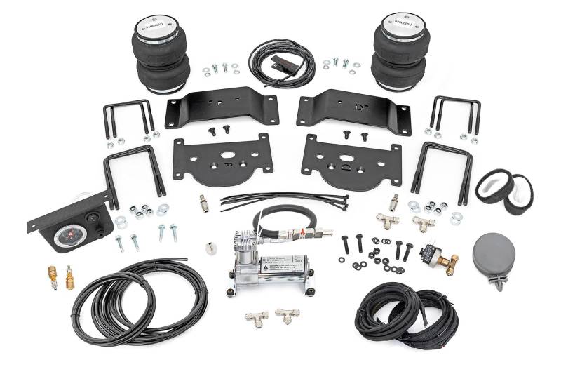 Ideal Leveling: Is your truck your workhorse? The main attraction of a pickup is the ability to haul and tow as needed. However, due to the weight in the bed or the condition of the rear leaf springs, your vehicle may become un-level under load. At Rough Country, we've designed a solution to eliminate these concerns. Introducing Rough Country's Rear Air Spring Kit.Heavy-Duty Construction: Rough Country's Rear Air Spring Kit includes two high-quality, double convoluted air bags, reinforced with durable powder-coated steel brackets and DOT-approved airlines. Whether you're towing a trailer or hauling heavy loads, this kit helps ensure your vehicle remains level, alleviating the strain on your trailer's tongue weight. The kit features 1/4" push-to-connect air fittings for easy installation, along with all necessary bracketry for a secure fit. Rough Country's Air Spring Kit supports up to 5,000 lbs of load, minimizing sway and preventing bottoming out while braking and steering.Easy Installation: Quick and simple setup for immediate use. Rough Country's kit can be installed at home with standard tools in just 5-6 hours, ensuring minimal downtime and fast, hassle-free installation.Onboard Air Compressor and Wireless Controller: For added convenience, Rough Country offers an optional onboard air compressor and wireless controller to easily adjust your air spring kit on the go. Control air pressure at the push of a button from the comfort of your vehicle.Reliable Warranty Coverage: Rough Country's Rear Air Spring Kit includes a limited lifetime warranty on the air springs and a two-year replacement warranty on the compressor, offering lasting protection against manufacturer defects. This industry-leading coverage ensures confidence in both quality and durability, so you can count on Rough Country to keep your truck performing at its best.