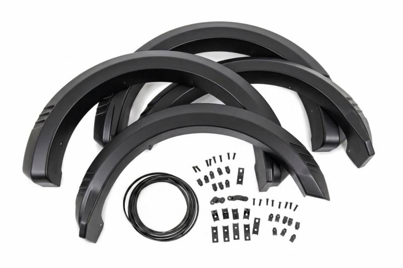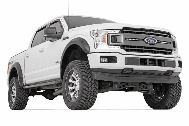 Bold Style with Real Protection: Rough Country's SF1 Fender Flares give your Ford F-150 the tough, finished look your build deserves. With a clean, one-of-a-kind design that complements your truck's body lines, these flares turn heads while providing practical utility. Designed with 1.75 inches of additional tire coverage and 5.25 inches of flare height, they offer the perfect clearance for oversized wheels and tires and help protect your truck from rocks, mud, and road debris. Integrated rear "mud catchers" further reduce tire sling along your truck's sides.Paint to Match or Customize Your Look: SF1 Fender Flares are available in a convenient Paint to Code option, allowing you to order them pre-painted to match your truck's factory color for a seamless finish right out of the box. Prefer a custom look? These flares also feature a paint-ready surface, giving you the flexibility to color match or personalize your truck's style.Built for Strength and Long Lasting Performance: Made from durable Tri Blend ABS, these fender flares are engineered for both toughness and flexibility. UV resistant for uncoated installs, they resist fading and discoloration caused by sun exposure, ensuring your truck maintains its aggressive appearance for years to come.Quick and Easy Installation: SF1 Fender Flares are a simple bolt-on upgrade using factory mounting points, so there's no drilling required. Each order includes all necessary hardware and step-by-step instructions for a fast, hassle-free installation. The flares can also be removed at any time if you want to return your truck to stock.Warranty You Can Trust: These fender flares are backed by Rough Country's 3-year limited warranty against manufacturer defects. The optional Paint to Code finish also includes a 1-year limited warranty covering paint adhesion and UV protection for added peace of mind.