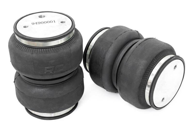 Introducing, Rough Country's Rear Air Spring Kits. Rough Country's Rear Air Spring Kits feature two RC branded high-quality double convoluted airbags complemented with DOT-approved airlines. Whether you plan on towing or hauling in the not-so-distant future Rough Country's Air Spring kit is the must-have accessory to ensure that your trailer is level reducing the weight off of the tongue of your trailer. Each kit offers 1/4" push connector fittings and all of the bracketry needed to ensure installation is lightning fast and secure! Best of all, Rough Country's Air Spring kit provides up to 5,000 lbs of load support to ensure that you experience less sway and bottoming out when braking and steering! Give yourself peace of mind on your next haul with Rough Country's Air Spring Kit!