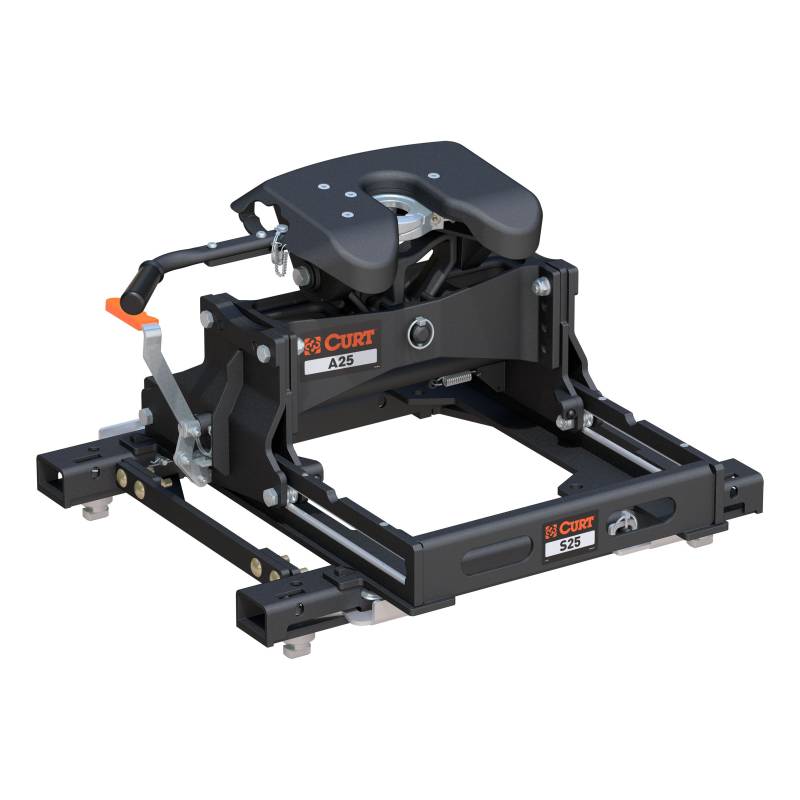 The CURT A25 5th wheel hitch offers smoother, quieter towing for your home-away-from-home, combining the patented technology of our A-series, an easier mounting system and the power of a 25K 5th wheel hitch. This 5th wheel hitch uses a patented cast yoke to allow for unimpeded head movement, while providing exceptional stability for the trailer. The yoke has a set of poly-torsion inserts to suppress shock loads and reduce excessive noise, and the head features high-strength, interlocking jaws to give the trailer stability and the freedom to pivot and swivel as needed. The A25 is also fast and simple to operate. It has a lockable, single-throw handle that self-resets to the ready-to-couple position after uncoupling, and it is equipped with a coupling indicator that shows the coupling status. This 25K 5th wheel hitch comes with the CURT S25 5th wheel slider and the CURT OEM puck system 5th wheel slider adapter. It is designed to be mounted on select Chevrolet Silverado or GMC Sierra pickups with the truck bed puck system (year range specific). Using a set of quarter-turn anchors, the adapter quickly and easily drop into the pucks, instantly mounting the A25 hitch and equipping the truck for 5th wheel towing. Once installed, the S20 slider can safely move the coupling point 12 in. toward the rear, allowing your short-bed truck to make turns without obstruction. The slider is comfortable and easy to operate, featuring a lift-style lever that is easily accessible over the side of the truck wall. The lever moves in a more user-friendly, ergonomic motion compared to traditional, pull-out-style levers. Best of all, the slider automatically latches into place in both directions, meaning you only have to get out of the truck once to complete the operation. This A25 hitch with puck system slider is only intended to fit the Chevrolet, Ford or GMC puck system and cannot be installed without it.