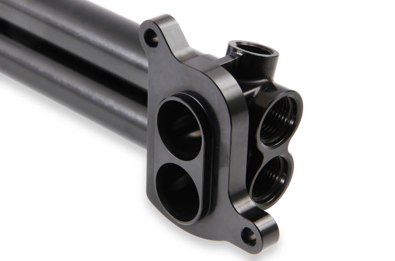 The Supercharged Gen III Hemi engine has a relatively large intercooler manifold on the back of the supercharger. The factory manifold may cause clearance issues in an engine swap into a classic muscle car or truck. The Earl's manifold is shorter and provides an additional 1.875" of clearance and allows the use of AN hoses for the coolant. Billet aluminum construction with black anodized finish.