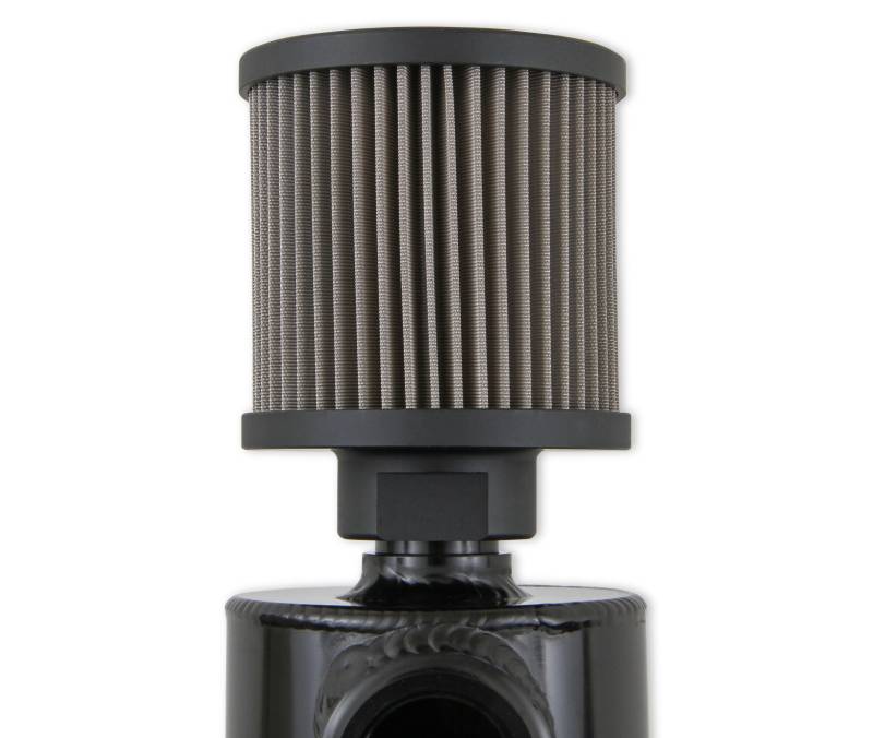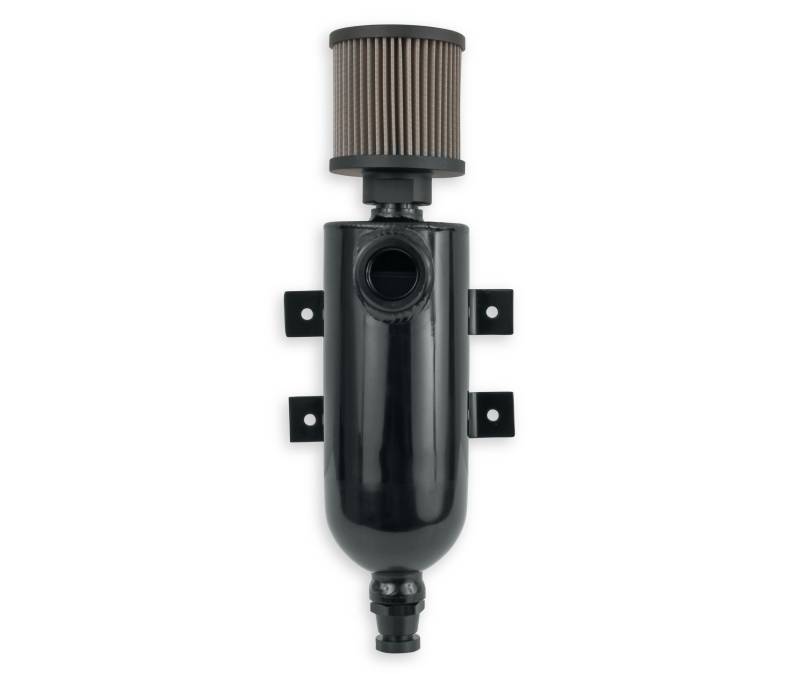 Earl's breather tanks are made from 6061 aluminum and have internal oil baffling. These tanks feature a -12 AN O-ring inlet port, knurled drain valve with an optional 1/8" NPT outlet port for use with a remote drain (or to drain back to the oil pan), w/ 4-bolt mounting brackets. Includes a heavy duty stainless steel mesh filter which has a billet aluminum housing to reduce weight. The filter may be removed to expose a -12AN Male. Ideal for use in all racing applications (i.e. engine PCV, dry sump tanks, transmissions, and rear-end venting). Black anodized finish.