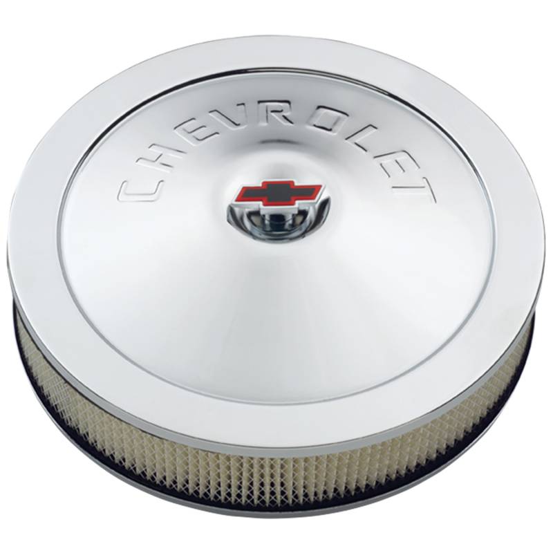Engine Air Cleaner Kit This engine carburetor air cleaner kit is a 14 inch diameter and features a stamped "Chevrolet" lettering on the top cover. This "Classic" style air cleaner also includes a "Bowtie" logo style center air cleaner nut. They are manufactured from high quality steel material and feature a great looking chrome finish. Overall installed height when on the carburetor is 3.375 inches. A 3" tall high flow paper air filter is also included. This is an officially licensed GM Performance Parts product. Sold as one complete kit. Backed by a limited 30 day factory warranty.