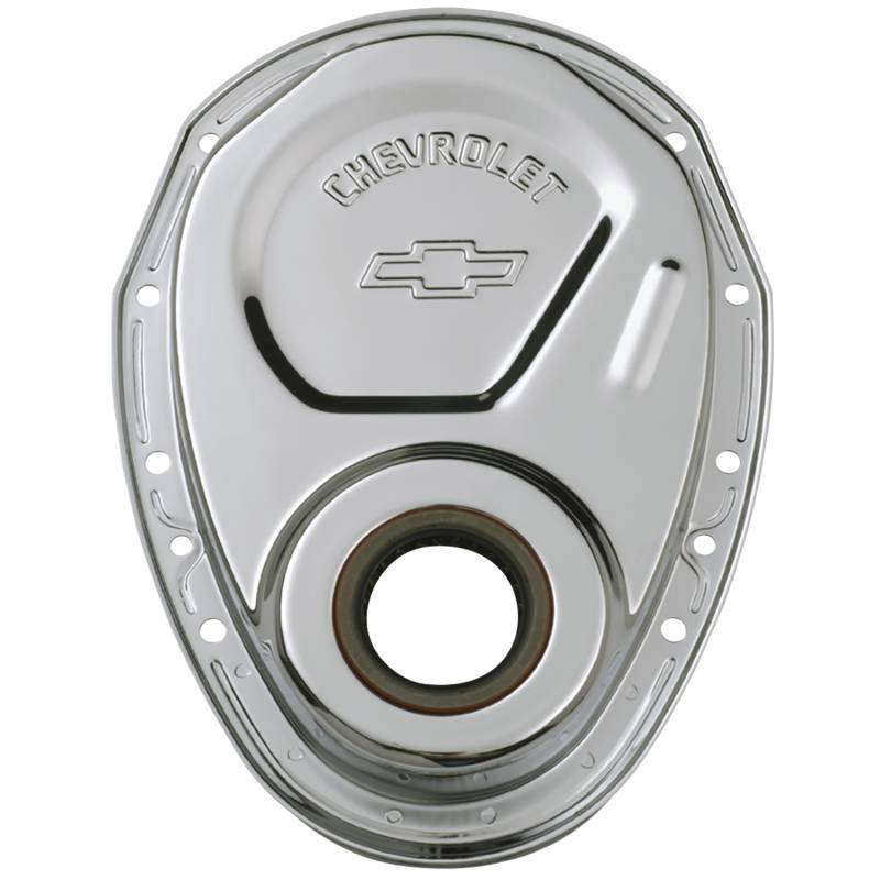 Timing Chain Cover This engine timing chain cover is manufactured from high quality steel material. Features a great looking chrome plated finish and include the Chevrolet and Bowtie logos. Designed to fit 1969 to 1991 Small Block Chevy engines. Front crankshaft oil seal is included. This is an officially licensed GM Performance Parts product. Sold individually. Backed by a limited 30 day factory warranty.