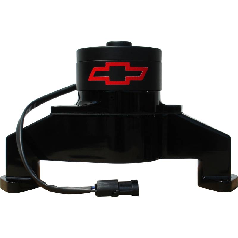 Electric Engine Water Pump Eliminates unnecessary weight and impeller-drag experienced at high RPM, pumps up to 35+ gallons of water per minute, and delivers the cooling that can make the difference between a win and second place! Durable but light-weight die-cast aluminum, epoxy powder coated for corrosion resistance in the color of your choice. Each unit comes with the popular Chevy Bowtie Emblem in red. Race or street. Comes with FREE inlet fitting (1in pipe to 1 3/4in hose), mating weather-tight connector.