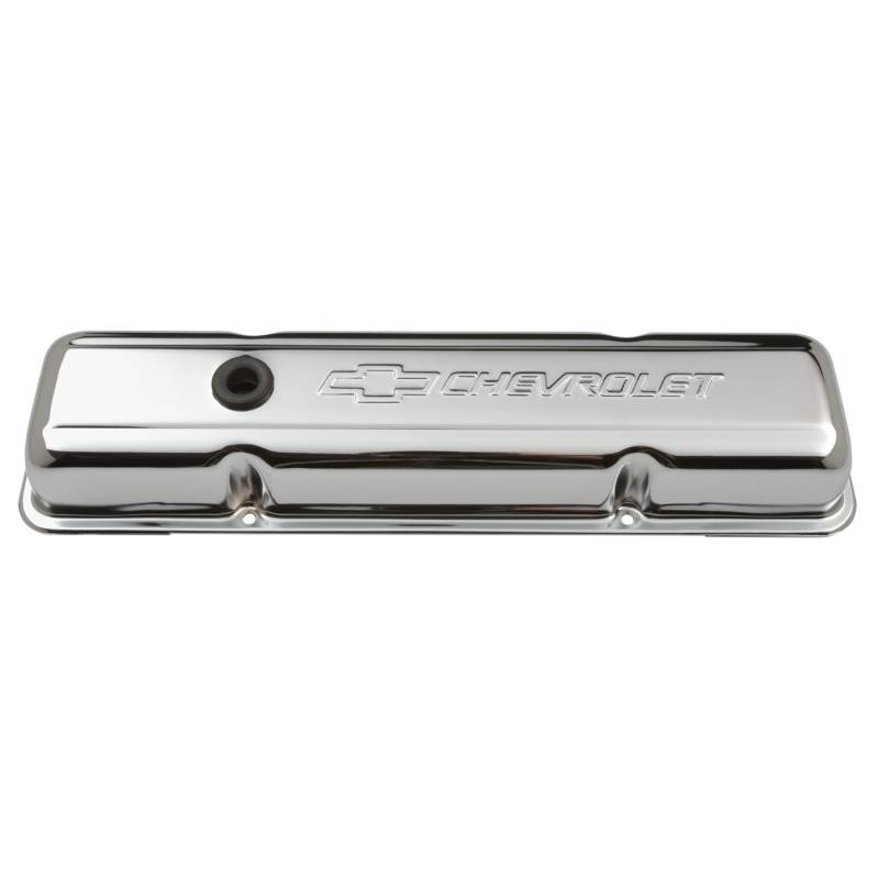 Engine Valve Covers These engine valve covers are manufactured from high quality stamped steel material. They are a short style valve cover and feature oil breather baffles. The valve covers have a great looking and long lasting chrome plated finish that also includes the "Chevrolet" and "Bowtie" logos. Designed to fit 1955 to 1986 262-400 Small Block Chevy engines. This an officially licensed GM Performance Parts product. Sold as one pair. Backed by a limited 30 day factory warranty.