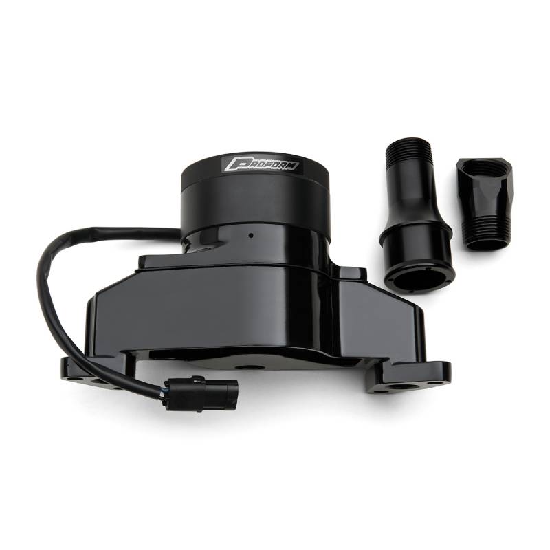 Electric Engine Water Pump This electric engine water pump fits Small Block Ford engines and is made from high-quality die cast aluminum. Features a great looking black powder coat finish. Unit has a flow rate of 35 GPM and only draws 6 amps. It includes a billet aluminum material 1.0 inch NPT to 1-3/4 inch hose fitting. Backing plate and weather-tight connectors are also included. Sold individually. Backed by a limited 30 day factory warranty.
