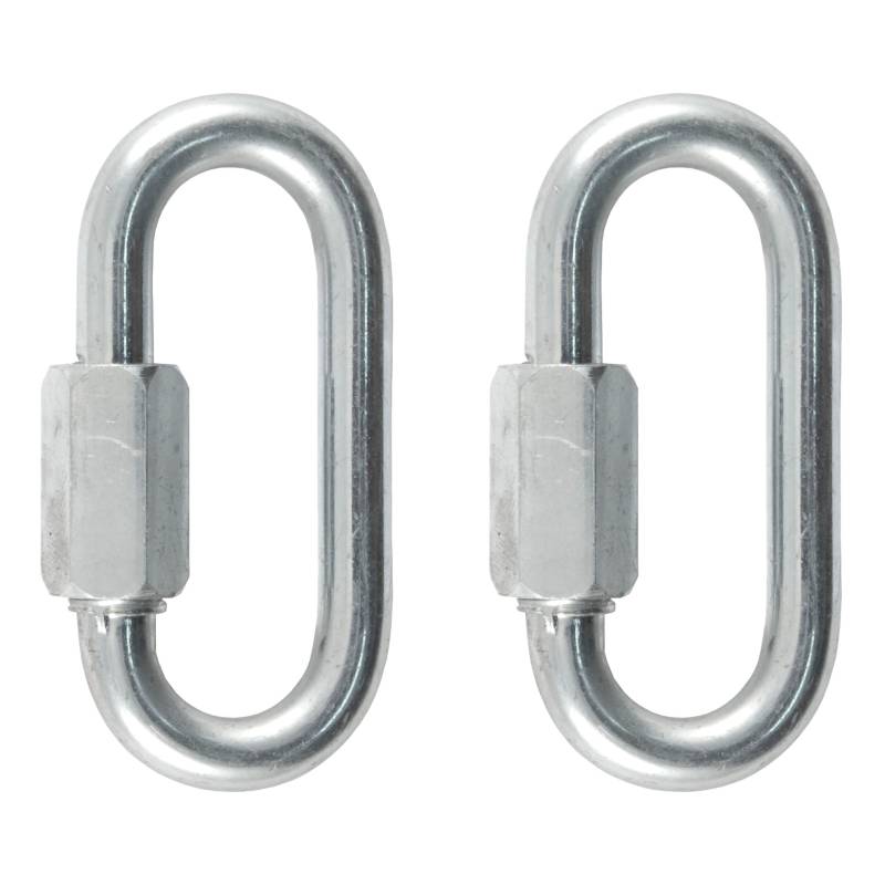 5/16" Quick Links (8,800 lbs. Breaking Strength, 2-Pack) CURT quick links are an extremely versatile and reliable tool to help you get to your destination and go a little further once you get there. A quick link is essentially a hook that is able to be fastened into a closed loop. This means it can be linked onto any D-ring or tie-down like a hook and just as easily secured like a seamless link in a chain. CURT quick links feature a special threaded end and barrel screw that allow them to be dependable and convenient. The threaded link requires no tools for tightening or loosening, though it does feature a hex shape that can accept a wrench for an extra tight hold. Quick link hooks can be used to connect rope, cable and chain, and they are the perfect safety accessory to maximize the security of your safety chains and trailer. Their list of possible applications also goes well beyond towing, giving you a reliable connection for rock climbing, boating, camping, setting up a swing or hammock, leashing the dog, repairing chain, fastening down cargo and more. To make sure our quick links are fit to face the outdoors and all of your undertakings, we construct them from heat-treated steel and give them a zinc-plated finish for durability and rust resistance. These CURT quick links feature a max load capacity of 1,760 lbs. and features a 5/16" diameter link.
