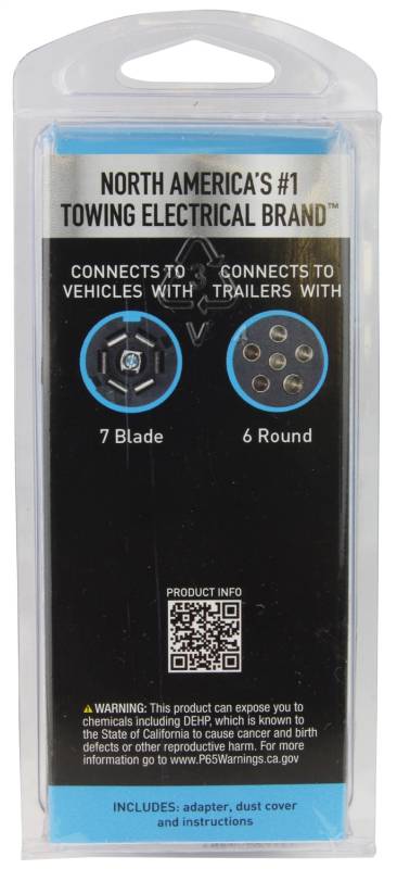 The 47555 7 Blade to 6 Pole Round adapter allows you to adapt down from a 7 Blade connector to a 6 Pole round trailer side connector without having to rewire the truck or trailer. This adapter also allows you to open it and change the pin locations for auxiliary and electric brakes making it the perfect adapter for either 6 Pole Round wiring code. An included dust cover adds an extra layer of weatherproofing for long lasting performance.