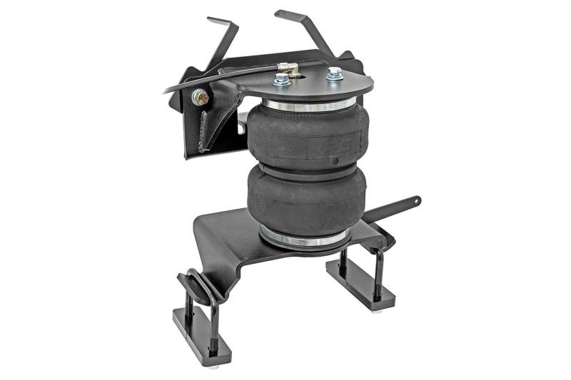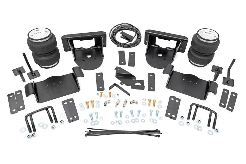 Ideal Leveling: Is your truck your workhorse? The main attraction of a pickup is the ability to haul and tow as needed. However, due to the weight in the bed or the condition of the rear leaf springs, your vehicle may become un-level under load. At Rough Country, we've designed a solution to eliminate these concerns. Introducing Rough Country's Rear Air Spring Kit.Heavy-Duty Construction: Rough Country's Rear Air Spring Kit includes two high-quality, double convoluted air bags, reinforced with durable powder-coated steel brackets and DOT-approved airlines. Whether you're towing a trailer or hauling heavy loads, this kit helps ensure your vehicle remains level, alleviating the strain on your trailer's tongue weight. The kit features 1/4" push-to-connect air fittings for easy installation, along with all necessary bracketry for a secure fit. Rough Country's Air Spring Kit supports up to 5,000 lbs of load, minimizing sway and preventing bottoming out while braking and steering.Easy Installation: Quick and simple setup for immediate use. Rough Country's kit can be installed at home with standard tools in just 5-6 hours, ensuring minimal downtime and fast, hassle-free installation.Onboard Air Compressor and Wireless Controller: For added convenience, Rough Country offers an optional onboard air compressor and wireless controller to easily adjust your air spring kit on the go. Control air pressure at the push of a button from the comfort of your vehicle.Reliable Warranty Coverage: Rough Country's Rear Air Spring Kit includes a limited lifetime warranty on the air springs and a two-year replacement warranty on the compressor, offering lasting protection against manufacturer defects. This industry-leading coverage ensures confidence in both quality and durability, so you can count on Rough Country to keep your truck performing at its best.