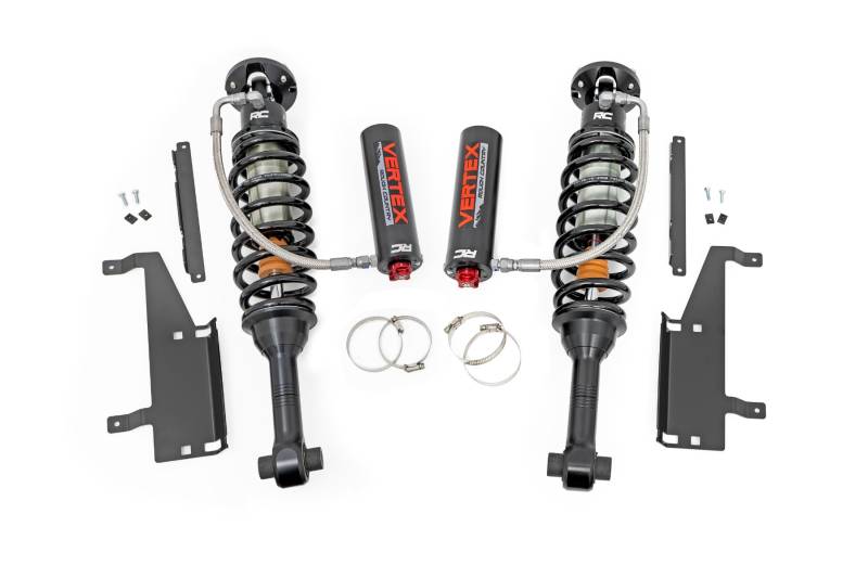 Unrivaled Performance: Unmatched Ride Quality. Experience the pinnacle of off-road control with Rough Country's 2.5 Vertex Reservoir Coilovers - precision-engineered to dominate any terrain while delivering a smooth, customizable ride.Built for the Extreme: Featuring a monotube design with an external remote reservoir, these nitrogen-charged coilovers increase oil capacity and damping sensitivity for superior heat dissipation and fade resistance. A massive 2.5-inch piston and 18mm chrome-hardened piston rod ensure maximum durability and performance in the toughest conditions. Engineered for Durability: A 3-stage seal system prevents dirt, debris, and fluid leakage, while the honed steel body and heat-treated alloy bearing extend longevity. The zinc-plated finish with a double clear coat and unbeatable salt spray resistance (over 400 hours) provide exceptional corrosion protection.Premium Design: These coilovers don't just perform - they turn heads. Featuring CNC-machined billet aluminum accents, a laser-etched RC logo, and premium "Vertex" decals, they combine high-end aesthetics with rugged reliability. They also feature a durable braided steel reservoir line and a laser-etched bracket system, ensuring a sleek, professional finish.Backed by Confidence: Covered by Rough Country's 3-year manufacturer's warranty, these coilovers offer long-term reliability and peace of mind for every adventure.Upgrade your ride today with Rough Country's 2.5 Vertex Coilovers - because performance, durability, and style should never be compromised.