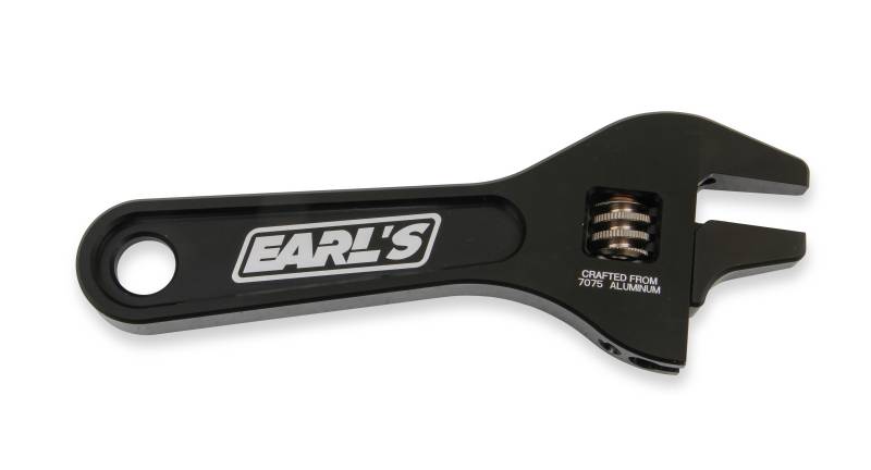 Tired of having to run to your toolbox multiple times to get the proper AN wrench? Earl's has engineered a solution! The new Earl's AN adjustable wrench is CNC machined from true aerospace grade 7075 billet aluminum and features a precision mechanism with a Steel Nickel knurled thumbwheel. The handle has chamfered edges that fit comfortably in your hand. Quick size adjustment make it ideal for use in the pit area, staging lanes, or back at the shop. Fits AN -3 to -12 hose ends.