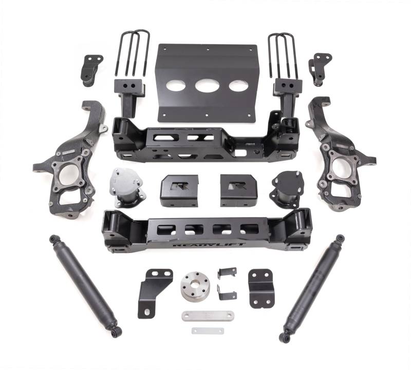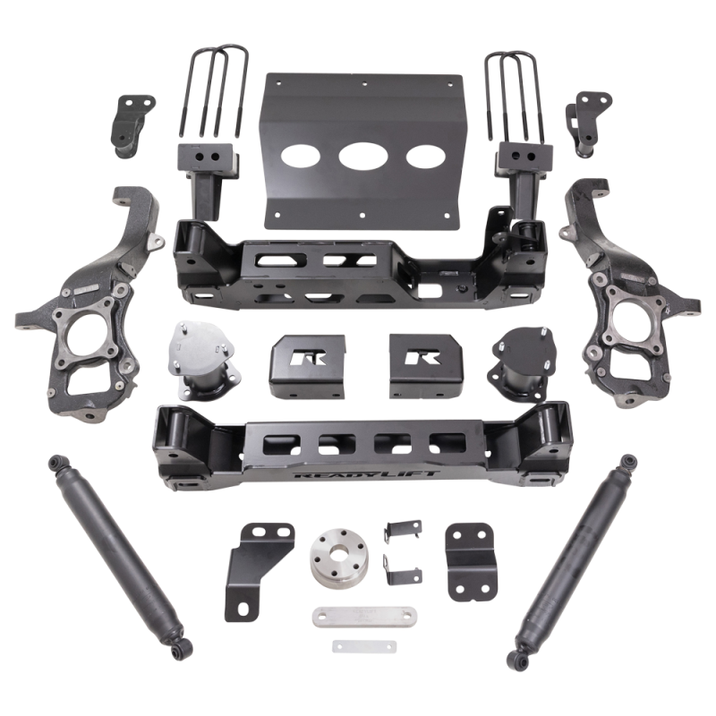 ReadyLIFT is now shipping our all-new 2021-2023 Ford F-150 4WD 6" Lift Kit delivering first-class ride and handling with plenty of tire clearance combined with a great-looking lifted stance in our all-new family of high-performance big lift kits for Ford F-150 4WD models. This new ReadyLIFT 6" Lift Kit is developed to give F-150 owners a complete big lift option that lifts the front of the vehicle 6" giving the rear a neutral stance. The all-new Ford F-150 4WD 6" Big Lift Kit is available in our base kit that delivers 6-inches of lift coupled with our twin-tube ReadyLIFT SST3000 performance rear shock SKU 44-21600. The new ReadyLIFT Ford F-150 6" kits are equipped with heavy-duty 1/4" steel plate construction front and rear crossmembers that offer unmatched strength for all driving conditions. Featuring a set of durable lifted knuckles and strut spacers, you gain enough ride height to run up to 35-inch tires with the right wheel! The new 6" systems include everything necessary to correct suspension, steering, and driveline geometry to maintain on-road handling while improving strength and offroad capability. Fabricated steel 4" tall rear block offers the correct amount of rear lift while the factory-style U-bolts aid in ease of installation. NOTE: Does not fit vehicles equipped with CCD, 2WD only, Tremor, and Raptor. NOTE: Not compatible with Ford BlueCruise