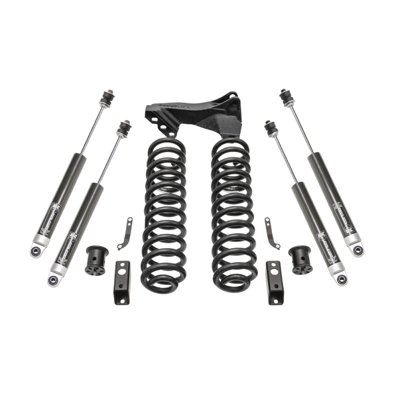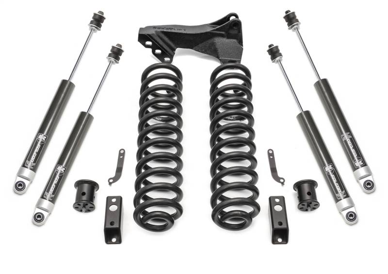 ReadyLIFT Suspension offers a 2.5" Lift Coil Spring Front leveling Kit made to fit 2011-2016 Ford Super Duty F250/F350 trucks. This kit includes front and rear Falcon 1.1 Monotube series shocks and our popular front track bar relocation bracket. This gives Super Duty owners an excellent alternative for lifting the front of your truck. This great new front leveling system will raise the front of your 2011-2016 4WD Super Duty truck 2.5" while including added value components such as the premiere Falcon 1.1 Monotube shocks and our track bar relocation bracket.. The 46-27290 coil spring system allows for increased tire sizes and widths along with providing improved ground clearance and a more commanding view of the road. This premiere leveling kit easily allows for 35" tall tires. The 46-27290 coil spring leveling kit delivers a great ride ride and handling performance! The key ingredients to improving your ride are the new specially engineered coil springs teamed with Falcon 1.1 Monotube series shocks and a track bar relocation bracket! This combination is more than just a leveling kit. This is a performance and ride enhancing kit that will really surprise you at how well it rides and performs both on and off road. The ReadyLIFT 2.5" Coil Spring Front leveling kit system for 2011-2016 Ford Super Duty F250 and F350 trucks also included model-specific brake line extension brackets, Our time-tested bump stop extension brackets and new front sway bar frame mount extension brackets to keep the factory sway bar where is supposed to be. If you want tough looks and a smooth but controlled ride, then you want the new 46-27290 Coil Spring Leveling Kit System. Your truck will thank you! NOTE: Super Duty trucks, depending on factory spring rate, may experience a minor variation in lift height. Final lift height may vary from 1.5" to 2.5". NOTE: 2011-2016 F250 vehicles may require a rear block kit to achieve a level stance.