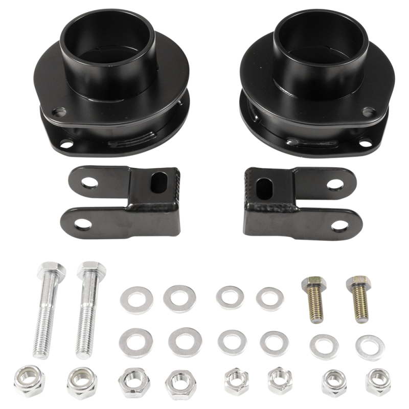 The 66-19180 includes heavy-duty laser-cut powder-coated steel front top mount coil spring spacers providing the ideal 1.75" of front leveling lift. It is that simple to level the front of these new RAM 4WD 2500/3500 HD trucks. New kits include a retention bolt has been added to lock the spacer to the frame and shock extensions have been added to optimize shock length after leveling the truck.