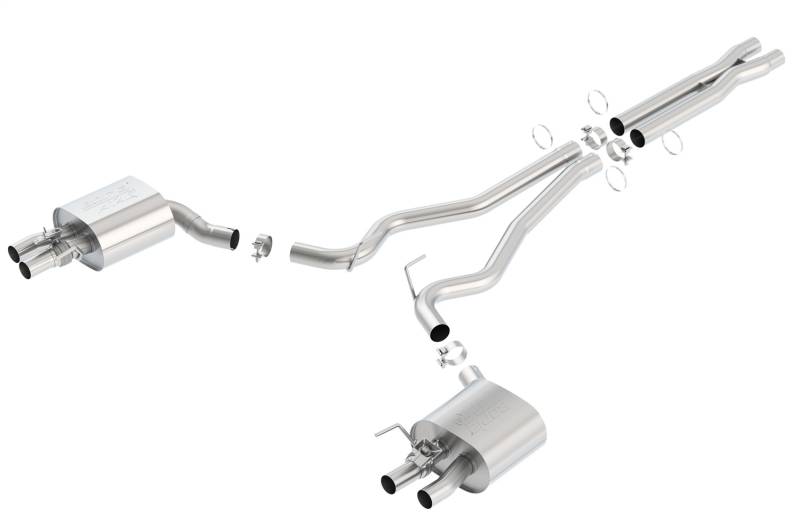Cat-Back Exhaust System - ATAK® This dual 2.75" diameter into the mufflers with dual 2.5" out of the mufflers Cat-Back™ system features the aggressive ATAK® sound. It has a Merge X-Pipe for increased performance and improved sound. BORLA®'S advanced muffler technology allows us to provide a no drone guarantee on this system. Tips NOT included, this system utilizes the factory exhaust tip/ bezels. System features valves for the Selectable Driving Mode. BORLA® Cat-Back™ and Axle-Back exhaust systems feature patented straight-through and multi-core technology designed to unleash hidden horsepower. Increased exhaust velocity adds power, driving excitement, fuel economy, and the distinctive BORLA® Sound of Power respected by motoring enthusiasts everywhere. Each system is built from premium T-304 stainless steel, superior to T-400 series knockoffs (such as 409), to give you the absolute best in performance and durability. Ultra-smooth mandrel bends ensure maximum flow & power, and precision computer numerical control (CNC) manufacturing ensures an accurate fit. Best of all, BORLA® stands behind every system with a Million-Mile Warranty. Just what you'd expect from the world's most experienced (and most winning) exhaust brand.