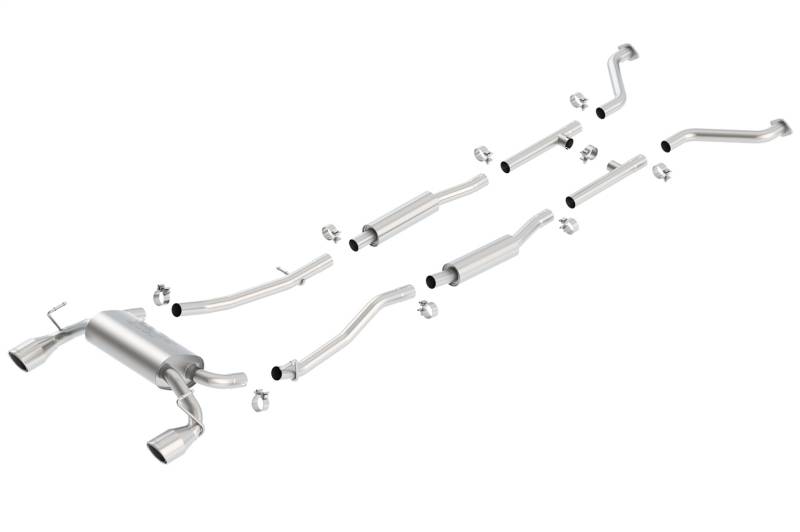 Cat-Back Exhaust System - S-Type Borla Performance Industries offers an incredible stainless steel exhaust system for the popular Nissan 350Z. Borla was among the first with a performance exhaust upgrade for the original Z cars. The 2.25" Borla Cat-Back System (PN 140045) is a True Dual exhaust with a H-Pipe and the famous Borla XR-1 Race-Bred Mufflers for increased performance and improved sound. Independent dyno tests have shown incredible gains of 15-20 horsepower & torque. Unlike other aftermarket exhaust systems that actually loose power in mid-range and low end, Borla gains through the entire RPM range. Serious performance enthusiasts understand that true power gains are not simply a big number at max RPM but rather strong torque gains over the full curve. The famous straight-through, patented designs allow Borla exhaust incredible flow increases. The Z car flow numbers improved 27% over stock! Flow makes power. Simple as that! The Borla True Dual Z-car lightweight high quality T-304 stainless steel system actually weighs 12 pounds less than the factory single exhaust. Add to this package a great look with large 4" angle cut rolled edge polished T-304 stainless steel tips and that famous Borla growl. It delivers the classic S-Type sound with no drone inside the vehicle. Once again, the genuine Borla exhaust puts the Zoom in the Z car. Isn't it time you stepped up to Borla ? Borla Performance Industries, the original pioneers of high quality, T-304 austenitic stainless steel (superior to T-409 or aluminized steel) free flow exhaust utilizes its patented award and race winning technology to deliver quality, sound, performance gains and enhanced fuel economy - all with an easy bolt-on installation. All Borla street products carry the famous Borla written million-mile warranty. Borla system is a "True Dual" design System contains a H-Pipe Classic S-Type sound