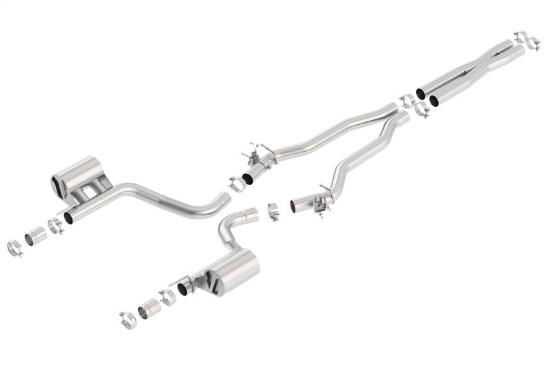 Cat-Back Exhaust System - ATAK® This system features the aggressive ATAK(r) sound and a merge X-Pipe for increased performance and improved sound. This system includes functioning MDS (multiple-displacement system) valves. Tips NOT included. Use factory tips or optional Borla(r) tips 60729, 60729BC, 60729CFBA. Borla(r) Cat-Back(tm) & Axle-Back exhaust systems feature patented straight-through and multi-core technology to unleash hidden horsepower. Increased exhaust velocity adds power, driving excitement, fuel economy, and the distinctive Borla(r) Sound of Power respected by motoring enthusiasts everywhere. Each system is built from premium T-304 austenitic stainless steel, superior to T-400 series knockoffs (such as 409), to give you the absolute best in performance and durability. Ultra-smooth mandrel bends ensure maximum flow & power, and precision computer numerical control (CNC) manufacturing ensures an accurate fit. Best of all, Borla(r) stands behind every system with a Million-Mile Warranty. Just what you'd expect from the world's most experienced (and most winning) exhaust brand. This system includes ACTIVE VALVES System contains a Merge X-Pipe Tips NOT included, use factory Bezel/ Valance, or optional Borla(r) tips 60729, 60729BC, 60729CFBA