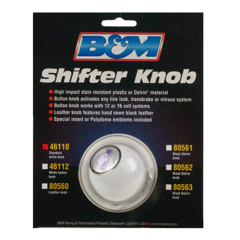 This shifter knob is constructed of a high-impact, stain-resistant plastic that is white in color. Due to the included selection of adapters, it is ideal for most shifters. The knob includes a clear lens and a B&M logo insert.\nFits 1/2-20, 3/8-24, 3/8-16 and 5/16-18 threads.