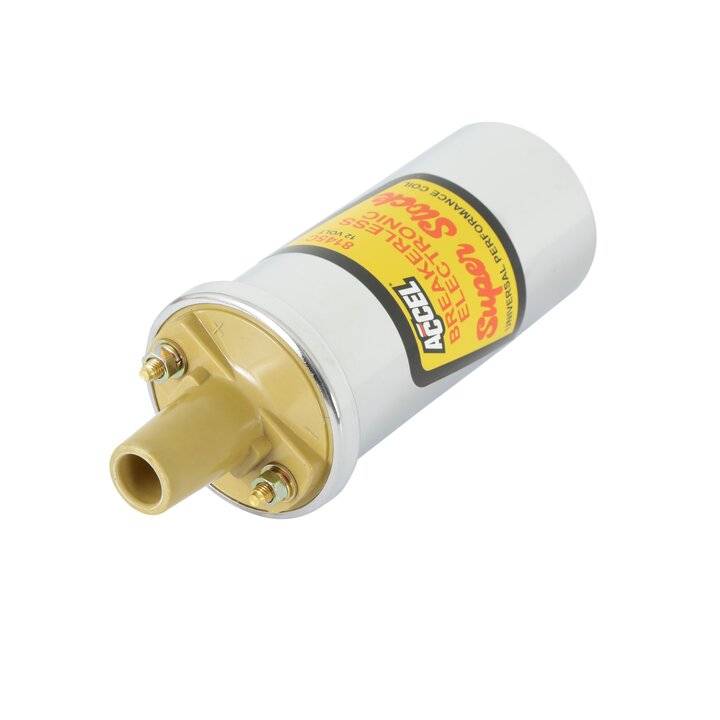 Excellent high performance coil for vehicles that have been converted from points to a breakerless electronic distributor or electronic ignition system, where a canister type oil filled can coil is preferred. Designed with optimized low resistance, high turns ratio windings to work specifically with ACCEL 41, 51, 52, 61 & 71000 Series breakerless electronic replacement distributors. Engineered for higher energy output resulting in quicker starting, improved throttle response and more high RPM power. Special crimped and soldered internal connections ensure positive contacts. High performance tan Alkyd tower provides ""flashover"" protection to primary terminals. Available in ""ACCEL Yellow"" or Chrome Plated can.