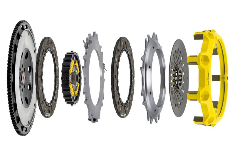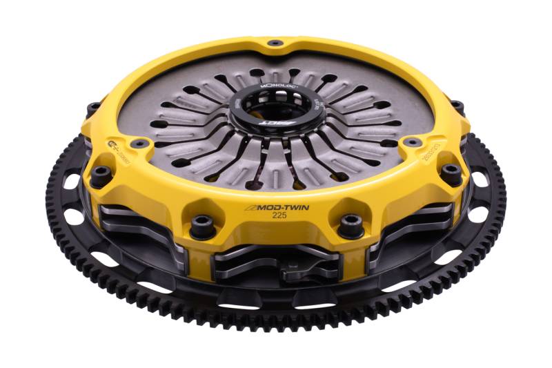 ACT Mod-Twin 225 Heavy Duty Sprung Street Clutch Kit T1S-S05 Mod-Twin 225 HD Sprung Street Kit is designed for high powered AWD street cars. It unites uncompromised pedal feel, durability, engagement quality with very high torque capacity by combining twice the organic friction surfaces with an ultra-durable spring center Mono-Drive hub in a completely modular design. Each diaphragm spring endures an exclusive four-stage heat treating process providing a consistent light pedal feel. Steel-backed Friction Plates with high quality organic friction materials deliver stable friction coefficient, good heat capacity and long clutch life. These Friction Plates uniformly transfer torque to the Mono-Drive sprung hub assembly which extends input shaft life and reduces driveline shock from torsional vibration. This kit includes a CNC-machined and dynamically balanced flywheel, pressure plate cover, diaphragm spring, face, puck-style ceramic friction plates, sprung Mono-Drive hub assembly, floater, patented Monoloc Collar, release bearing, alignment tool and pilot bearing (if needed). Mod-Twin clutches are fully rebuildable and most components can be ordered separately. "Excellence in Performance", backed by the best one-year warranty in the industry!