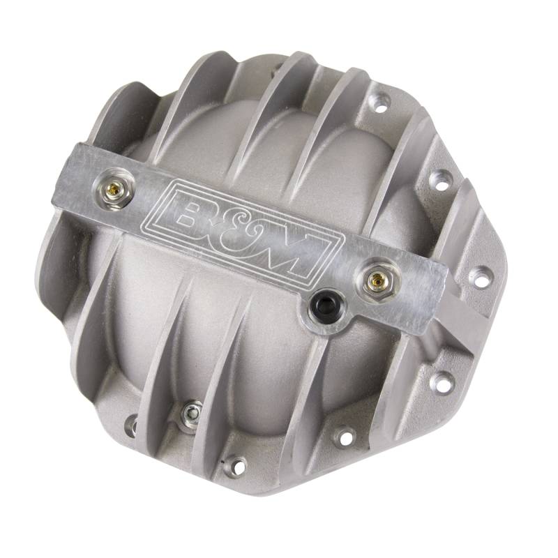 Our engineers designed the line of Hi-Tek differential covers to not only look good but address a number of weaknesses of the factory-stamped steel covers. First, they started by constructing the covers of thick A356.0-T6 aluminum, which dissipates heat much faster than the factory steel unit keeping the fluid temperature lower under high-stress loads vs. a steel cover. Then for added durability, we added a reinforced center bar for extra strength along with load bolts to help prevent bearing cap deflection under severe loads. The internal shape of the cover retains the smooth round back internally to help keep the fluid flow going over the ring gear to properly lubricate and cool the bearings and ring & pinion gears. Additional features include a magnetic drain plug for catching ferrous metal particles, a machined B&M logo, and all necessary hardware and easy-to-follow detailed instructions for a quick and simple installation you can do at home.