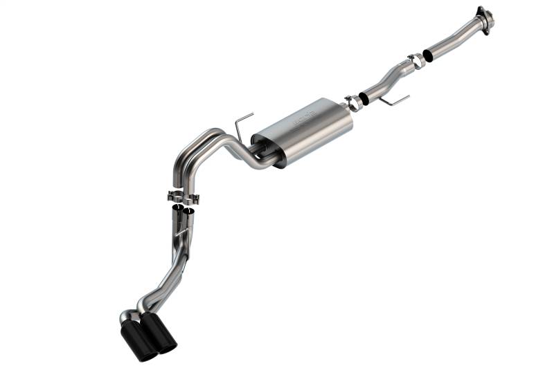Cat-Back Exhaust System - S-Type The 3" diameter into dual 2.25" Borla(r) Cat-Back(tm) system was specifically designed to enhance the power and sound of the Ford F-150 equipped with the 5.0L V8 engine. The dual side (passenger side) exit configuration replaces the single factory tail pipe, and has single 4" round black chrome on T-304 stainless steel tips on each tail pipe. Using Borla(r) Stainless Steel Polish p# 21499 is NOT recommended with these black chrome tips. We suggest cleaning the tips with hot water and a microfiber cloth. A system with bright chrome on T-304 stainless steel tips is also available. This system features the popular S-Type with no drone. Additional systems are available with different options for sound level, tip finish and tip exits. Add adapter 60564 for Regular Cab with Long Bed (8' 2") 141.5" wheelbase vehicles. Borla(r) Cat-Back(tm) & Axle-Back exhaust systems feature patented straight-through and multi-core technology to unleash hidden horsepower. Increased exhaust velocity adds power, driving excitement, fuel economy, and the distinctive Borla(r) Sound of Power respected by motoring enthusiasts everywhere. Each system is built from premium, high-quality T-304 stainless steel, to give you the absolute best in performance and durability. Ultra-smooth mandrel bends ensure maximum flow & power, and computer numerical control (CNC) manufacturing ensures an accurate fit. All this is backed by our unsurpassed Million Mile Warranty. System Features: Cat-Back(tm) System Dual Side Exit 4" Round Black Chrome On T-304 Stainless Steel Tips S-Type Sound Level T-304 Stainless Steel Construction Bolt-On Installation Million Mile Warranty EXCEPT Tremor and Black Appearance Package Add adapter 60564 for Regular Cab with Long Bed (8' 2") 141.5" wheelbase vehicles
