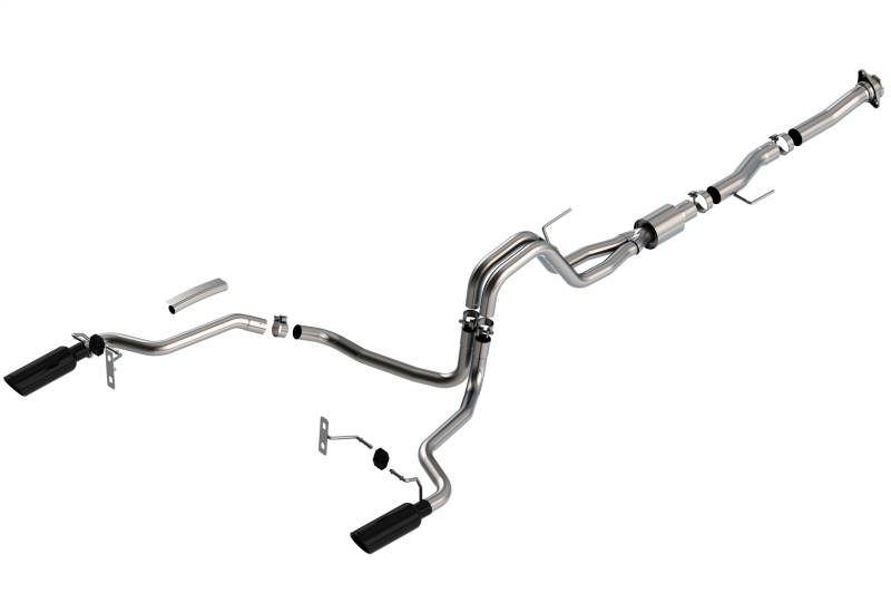 Cat-Back Exhaust System - ATAK® The 3" diameter into dual 2.25" Borla(r) Cat-Back(tm) system 14086 was specifically designed to enhance the power and sound of the Ford F-150 equipped with the 5.0L V8 engine. The split rear exit configuration replaces the single factory tail pipe, and has single 4" round black chrome on T-304 stainless steel tips on each tail pipe. Using Borla(r) Stainless Steel Polish p# 21499 is NOT recommended with these black chrome tips. We suggest cleaning the tips with hot water and a microfiber cloth. A system with bright chrome on T-304 stainless steel tips is also available. This system features the aggressive ATAK(r) sound with no drone. Additional systems are available with different options for sound level, tip finish and tip exits. Add adapter 60564 for Regular Cab with Long Bed (8') 141.5" wheelbase vehicles. Borla(r) Cat-Back(tm) & Axle-Back exhaust systems feature patented straight-through and multi-core technology to unleash hidden horsepower. Increased exhaust velocity adds power, driving excitement, fuel economy, and the distinctive Borla(r) Sound of Power respected by motoring enthusiasts everywhere. Each system is built from premium, high-quality T-304 austenitic stainless steel, superior to T-400 series knockoffs (such as 409), to give you the absolute best in performance and durability. Ultra-smooth mandrel bends ensure maximum flow & power, and precision computer numerical control (CNC) manufacturing ensures an accurate fit. All this is backed by our unsurpassed Million Mile Warranty. System Features: Cat-Back(tm) System Split Rear Exit 4" Round Black Chrome On T-304 Stainless Steel Tips ATAK(r) Sound Level T-304 Stainless Steel Construction Bolt-On Installation Million Mile Warranty EXCEPT Tremor and Black Appearance Package Add adapter 60564 for Regular Cab with Long Bed (8' 2") 141.5" wheelbase vehicles