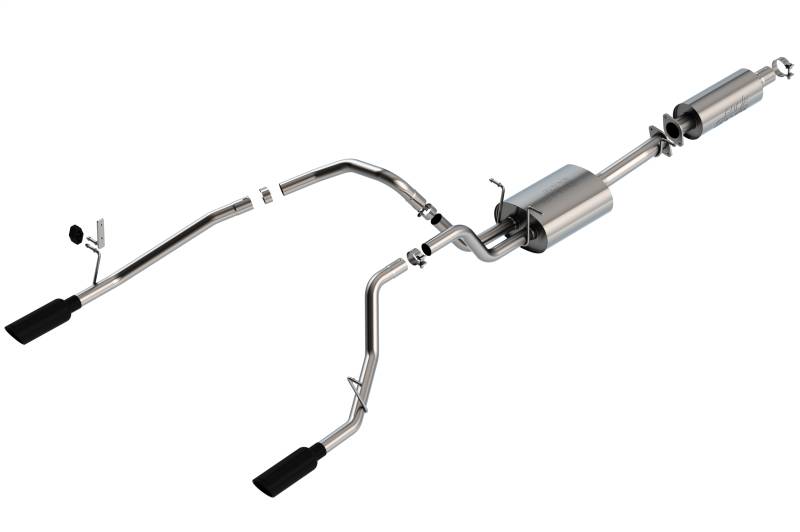 Cat-Back Exhaust System - S-Type Coverage includes Rebel models. Does NOT fit Ram Classic models. This 3" diameter into dual 2.25" BORLA® Cat-Back™ system is designed to convert your Ram 1500 V6 single outlet system to a dual outlet system. It was developed with performance and sound in mind for the 3.6L Pentastar engines. The system features a split rear exit with single 4" round black chrome on T-304 stainless steel tips on each tail pipe that exit "Under the Bumper". Using BORLA® Stainless Steel Polish p# 21461 is NOT recommended with these black chrome tips. We suggest cleaning the tips with hot water and a microfiber cloth. A system with 4" bright chrome on T-304 stainless steel tips is also available. Our classic S-Type sound level will provide a more aggressive exhaust tone and volume with no drone inside the vehicle. Optional resonator 60716 can be added to the system to dampen the sound level. BORLA® Cat-Back™ and Axle-Back exhaust systems feature patented straight-through and multi-core technology designed to unleash hidden horsepower. Increased exhaust velocity adds power, driving excitement, fuel economy, and the distinctive BORLA® Sound of Power respected by motoring enthusiasts everywhere. Each system is built from premium, high-quality T-304 austenitic stainless steel, superior to T-400 series knockoffs (such as 409), to give you the absolute best in performance and durability. Ultra-smooth mandrel bends ensure maximum flow & power, and precision computer numerical control (CNC) manufacturing ensures an accurate fit. A rugged truck needs a durable exhaust system, so bolt on a BORLA®. All Borla® Cat-Back™ and Axle-Back systems are made in the USA and are covered by our Million-Mile warranty. Tips exit Under the Bumper This system is designed to convert your Original Equipment single system to a dual outlet system. Coverage includes Rebel models Does NOT fit Ram Classic Optional resonator 60716 can be added to the system to dampen the sound level