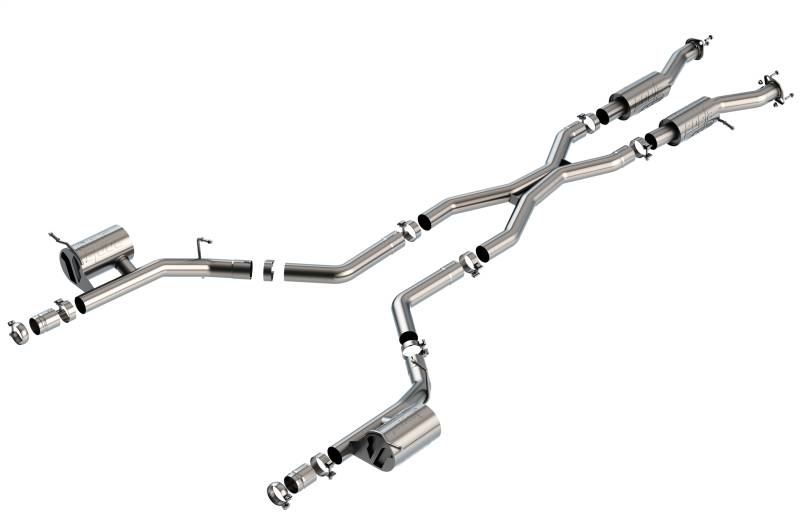 Cat-Back Exhaust System - ATAK® NO 2022 Model. Borla(r) presents their premium exhaust systems for the Dodge Durango SRT Hellcat. Our Cat-Back(tm) systems were developed and tuned for the supercharged 6.2L HEMI. This system features a merge X-Pipe for increased performance and improved sound. Our ATAK(r) system delivers an aggressive, head-turning sound. For a comfortable driving experience, we guarantee No-Drone with our exhaust systems. This Cat-Back(tm) features a dual 3" system WITHOUT exhaust tips for those who wish to retain the factory tips. Tips NOT included, reuse factory tips. A system with bright chrome on T-304 stainless steel tips, and a system with black chrome on T-304 stainless steel tips are also available. All Borla(r) systems are built with T-304 stainless steel for added durability and long life. Ultra-smooth mandrel bends ensure maximum flow & power, and precision computer numerical control (CNC) manufacturing ensures an accurate fit. All Borla(r) Cat-Back(tm) and Axle-Back systems are made in the USA and are covered by our Million-Mile warranty. System Features: System contains a merge X-Pipe 3" diameter system System does NOT include tips. Reuse O.E. tips.