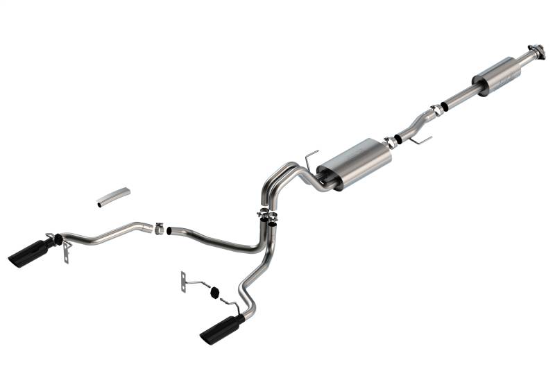Cat-Back Exhaust System - Touring The 3" into dual 2.25" diameter Borla(r) Cat-Back(tm) system was specifically designed to enhance the power and sound of the Ford F-150 equipped with the 5.0L V8 engine. The split rear exit configuration replaces the single factory tail pipe, and has single 4" round black chrome on T-304 stainless steel tips on each tail pipe. Using Borla(r) Stainless Steel Polish p# 21499 is NOT recommended with these black chrome tips. We suggest cleaning the tips with hot water and a microfiber cloth. A system with bright chrome on T-304 stainless steel is also available. This system features the mellow Touring sound that gives you a mild sound of power with no drone. Additional systems are available with different options for sound level, tip finish and tip exits. Add adapter 60556 for Crew Cab with Standard Bed (6' 7') 157.2" Wheelbase vehicles. Add adapter 60564 for Extended Cab with Long Bed (8' 2") 164.1" Wheelbase vehicles. Borla(r) Cat-Back(tm) & Axle-Back exhaust systems feature patented straight-through and multi-core technology to unleash hidden horsepower. Increased exhaust velocity adds power, driving excitement, fuel economy, and the distinctive Borla(r) Sound of Power respected by motoring enthusiasts everywhere. Each system is built from premium, high-quality T-304 austenitic stainless steel, superior to T-400 series knockoffs (such as 409), to give you the absolute best in performance and durability. Ultra-smooth mandrel bends ensure maximum flow & power, and precision computer numerical control (CNC) manufacturing ensures an accurate fit. All this is backed by our unsurpassed Million Mile Warranty. System Features: Cat-Back(tm) System Split Rear Exit 4" Round Black Chrome On T-304 Stainless Steel Tips Touring Sound Level T-304 Stainless Steel Construction Bolt-On Installation Million Mile Warranty EXCEPT Tremor and Black Appearance Package Add adapter 60556 for Crew Cab with Standard Bed (6' 7") 157.2" wheelbase vehicles Add adapter 60564 for Extended Cab with Long Bed (8' 2") 164.1" wheelbase vehicles