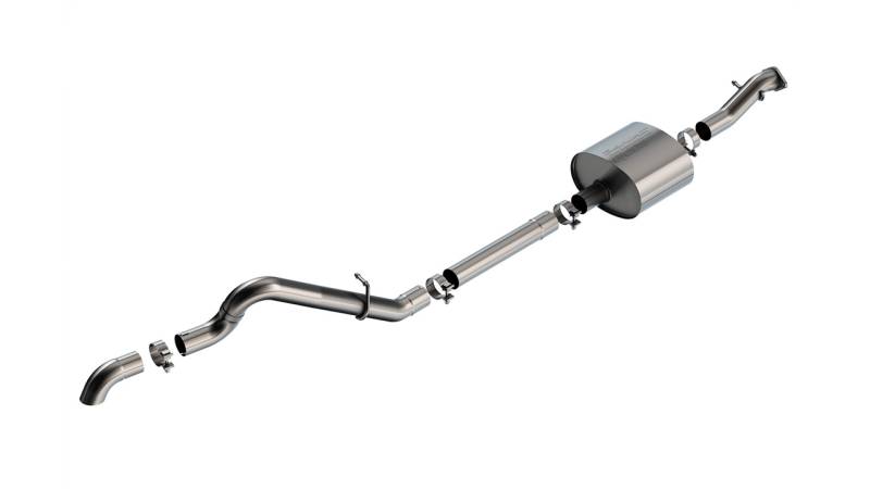 Cat-Back Exhaust System - S-Type This 2.75" diameter High Clearance Climber / Rock Crawler Cat-Back(tm) system is designed with ground clearance in mind. It features a brushed 2.75" T-304 stainless steel turn down tip and is the ideal system for off-roading, overlanding, or rock crawling. Positioned between the Touring and the ATAK(r), the S-Type delivers a noticeable increase in sound and overall volume without being intrusive. As expected, the system is drone-free to ensure an enjoyable ride inside the vehicle. This system is specifically tuned for flow and sound on the Bronco's 2.7L engine. Ultra-smooth mandrel bends ensure maximum flow & power, and precision computer numerical control (CNC) manufacturing ensures an accurate fit. The system's T-304 stainless steel construction ensures it can handle whatever you throw its way. For performance and sound on the trails, choose Borla(r). Best of all, we stand behind every system with a Million-Mile Warranty, just what you'd expect from the world's most experienced (and most winning) exhaust brand. High clearance Climber design See below for additional Product Features & Benefits