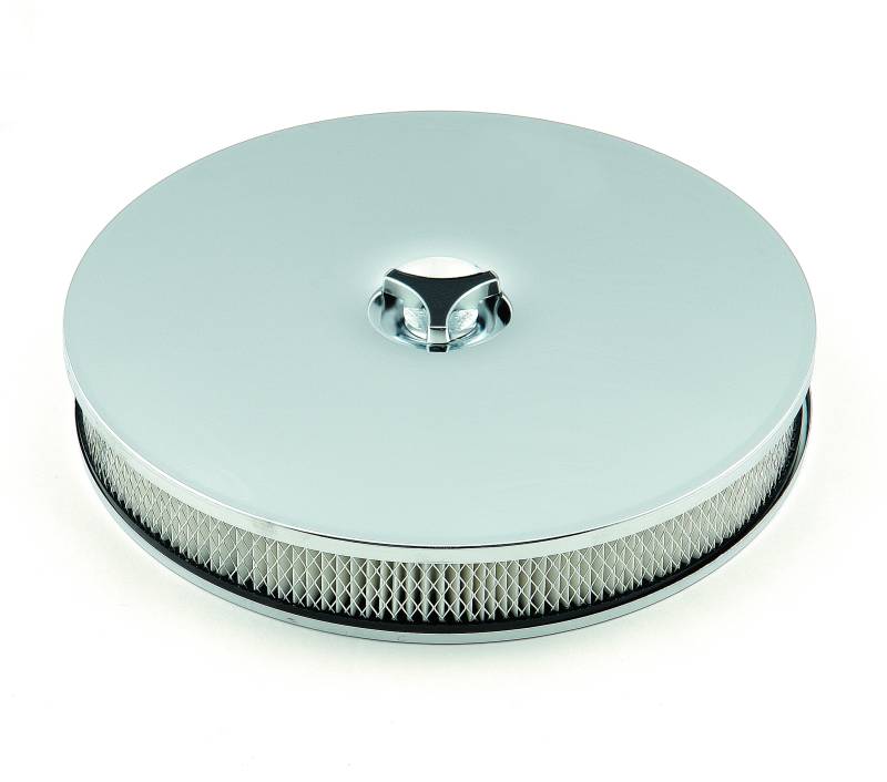 Do you have hood to air cleaner clearance problems? Mr. Gasket air cleaner will solve that problem. 14 inch diameter x 2-1/4 inch tall. This chrome plated steel air cleaner fits all 5-1/8 inch carb neck. Designed to fit cars with minimal hood clearance. Filter element is flame retardant with high CFM rating. Included are all PVC (positive crankcase ventilation) fittings and necessary hardware for easy installation.