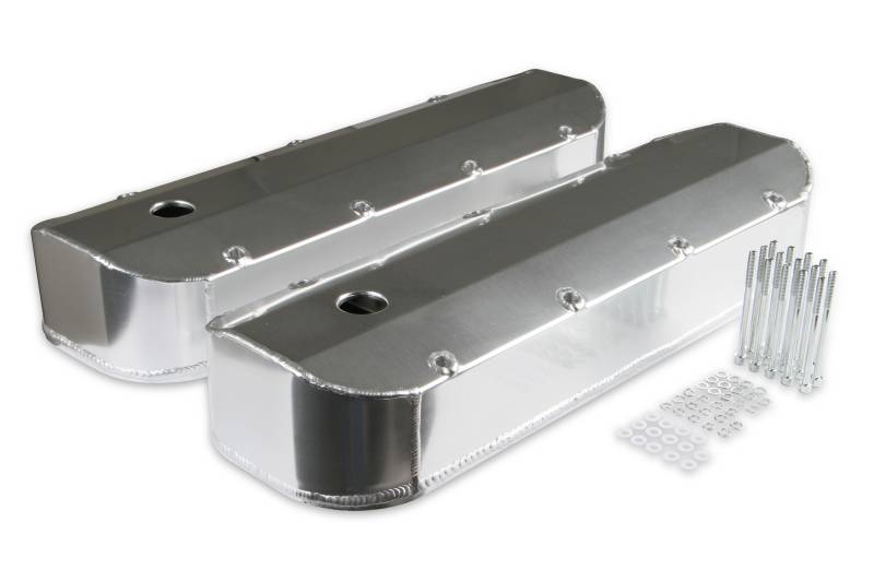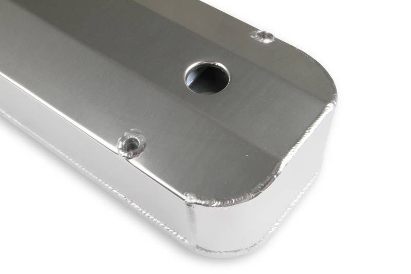 Fabricated from lightweight aluminum and features a smooth top with a baffled opening and long mounting bolts. Has 1/4 inch thick 1-piece mounting flange which ensures a flat mating surface along with aluminum tubes welded into the mounting holes to maintain rail flatness and increase valve cover strength. Includes mounting hardware.