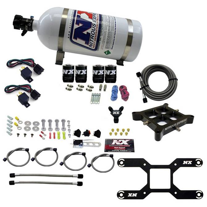 4150 DUAL STAGE BILLET CROSSBAR, (50-300 & 100-500HP) WITH 10LB BOTTLE. The new NX Billet Crossbar nitrous plate systems have just raised the bar in nitrous plate technology. The CNC machined design eliminates round spray bars resulting in excellent atomization and cylinder distribution. With no spray bars to sag, rotate or disrupt airflow, this is truly the Next Generation in cross bar nitrous plate technology. This system includes a 10lb nitrous bottle with the billet aluminum Lightning 45 bottle valve. This valve not only looks great