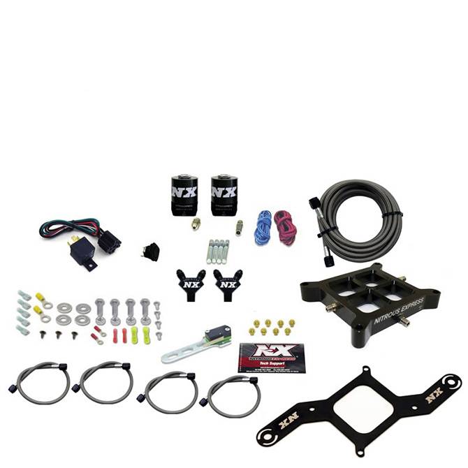 4150 BILLET CROSSBAR STAGE 6 The new NX Billet Crossbar nitrous plate systems have just raised the bar in nitrous plate technology. The CNC machined design eliminates round spray bars resulting in excellent atomization and cylinder distribution. With no spray bars to sag, rotate or disrupt airflow, this is truly the Next Generation in cross bar nitrous plate technology. This crossbar nitrous system includes more than the standard crossbar nitrous kit. It includes a custom solenoid bracket, billet aluminum y fittings, braided stainless solenoid to plate lines, nickel plated fittings, wide open throttle switch, master arming switch, 40 Amp relay and relay harness. This system is designed for 4150 flange manifolds and includes jetting for 50, 100, 150, 200, 250 & 300HP.
