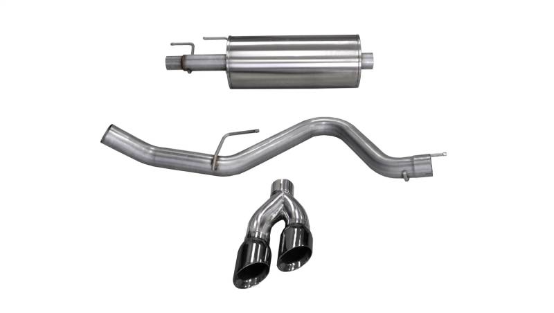 3.0in. Cat-Back Single Side Exit with Twin 4.0in. Black PVD Pro-Series Tips CORSA's Patented Reflective Sound Cancellation(R) (RSC) Technology allows acoustic engineers to create a drone free exhaust sound, styled specifically to fit the personality of your vehicle. Each system is designed to increase vehicle performance, deliver an AGGRESSIVE SOUND under acceleration and a DRONE-FREE EXPERIENCE during cruise. Performance gains are not affected by sound choice. Patented No Drone Reflective Sound Cancellation RSC Technology Custom Tuned - Aggressive Exhaust Note No Drone At Cruise 304 Stainless Steel Construction Dual Walled Polished Stainless Steel Tips