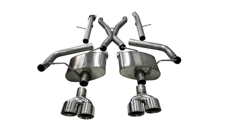 2.75in. Cat-Back Dual Rear Exit with Twin 4.5in. Polished Pro-Series Tips CORSA's Patented Reflective Sound Cancellation(R) (RSC) Technology allows acoustic engineers to create a drone free exhaust sound, styled specifically to fit the personality of your vehicle. Each system is designed to increase vehicle performance, deliver an AGGRESSIVE SOUND under acceleration and a DRONE-FREE EXPERIENCE during cruise. Performance gains are not affected by sound choice. Patented No Drone Reflective Sound Cancellation RSC Technology Custom Tuned - Aggressive Exhaust Note No Drone At Cruise 304 Stainless Steel Construction Dual Walled Polished Stainless Steel Tips
