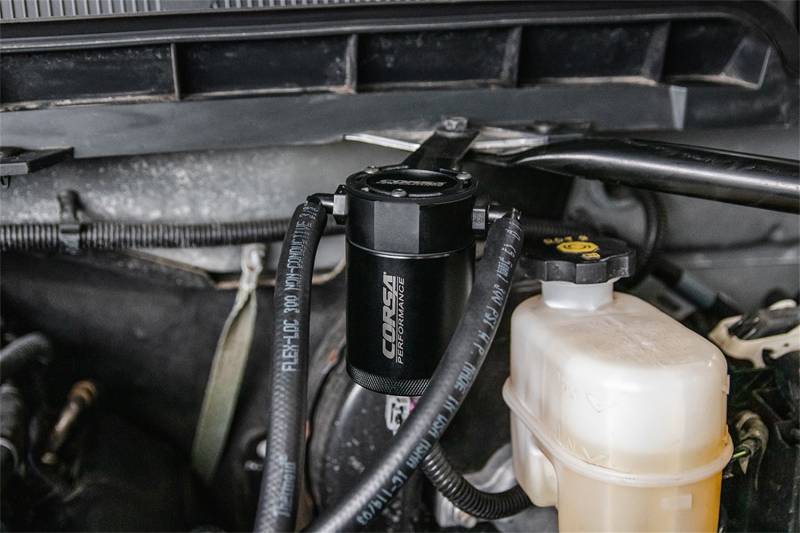 CORSA Performance's oil catch cans are the latest in a line of performance parts designed to maximize vehicle performance and longevity. Made from 6061 aluminum and featuring a multi-stage oil separation system, CORSA Performance oil catch cans work to eliminate blow-by of gas, water, oil vapors and particulates from the airpath. By reducing the impacts of blow-by, oil catch cans prevent damage to sensitive intake components and helps reduce carbon build-up on valves that over time reduce engine performance. Each vehicle specific oil catch can has been designed with OEM style quick disconnect fittings, premium automotive-grade hoses and upgraded components to ensure your vehicle runs at peak performance. Through careful design CORSA engineers have mounted each oil catch can in an easily accessible yet safe location allowing for ease of serviceability.