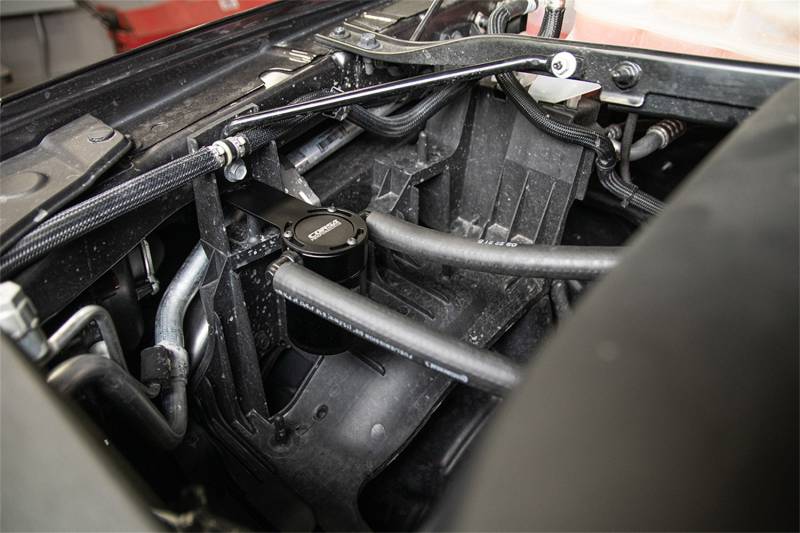 CORSA Performance's oil catch cans are the latest in a line of performance parts designed to maximize vehicle performance and longevity. Made from 6061 aluminum and featuring a multi-stage oil separation system, CORSA Performance oil catch cans work to eliminate blow-by of gas, water, oil vapors and particulates from the airpath. By reducing the impacts of blow-by, oil catch cans prevent damage to sensitive intake components and helps reduce carbon build-up on valves that over time reduce engine performance. Each vehicle specific oil catch can has been designed with OEM style quick disconnect fittings, premium automotive-grade hoses and upgraded components to ensure your vehicle runs at peak performance. Through careful design CORSA engineers have mounted each oil catch can in an easily accessible yet safe location allowing for ease of serviceability.