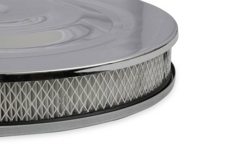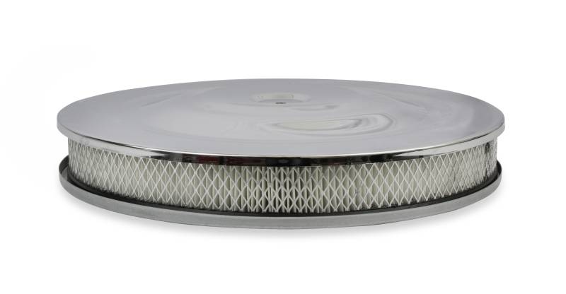 This Mr. Gasket Air Cleaner has chrome plated steel top and base. Fits most carburetors with a 5-1/8 inch neck. Has a 14 x 2 inch open paper filter element with wire mesh surround. Base has punch out for included pcv fitting. Carburetor stud and wing nut included. Overall height is 2-1/4 inch.