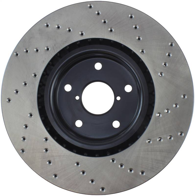 StopTech Drilled Sport Rotors are 1-piece direct replacement brake discs for factory brake systems and stock calipers that look great behind your wheels - and offer significantly improved braking performance. The unique cross-drilling aids with heat and brake dust dispersal; prevents glazing of the pads; adds bite and improves wet and dry braking performance. Built to last; the black e-coating provides protection from corrosion and the high carbon metallurgy (in most applications) offers quieter operation; better crack resistance and increased performance.