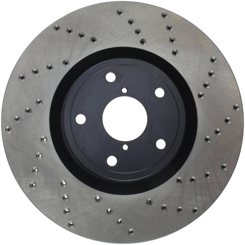 StopTech Drilled Sport Rotors are 1-piece direct replacement brake discs for factory brake systems and stock calipers that look great behind your wheels - and offer significantly improved braking performance. The unique cross-drilling aids with heat and brake dust dispersal; prevents glazing of the pads; adds bite and improves wet and dry braking performance. Built to last; the black e-coating provides protection from corrosion and the high carbon metallurgy (in most applications) offers quieter operation; better crack resistance and increased performance.