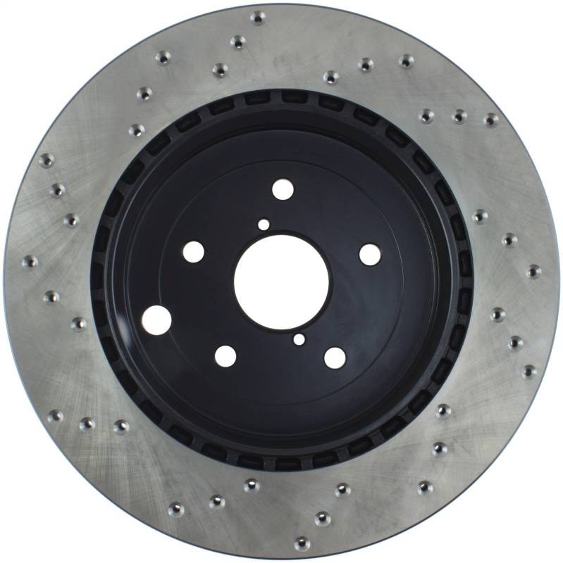 StopTech Drilled Sport Rotors are 1-piece direct replacement brake discs for factory brake systems and stock calipers that look great behind your wheels - and offer significantly improved braking performance. The unique cross-drilling aids with heat and brake dust dispersal; prevents glazing of the pads; adds bite and improves wet and dry braking performance. Built to last; the black e-coating provides protection from corrosion and the high carbon metallurgy (in most applications) offers quieter operation; better crack resistance and increased performance.