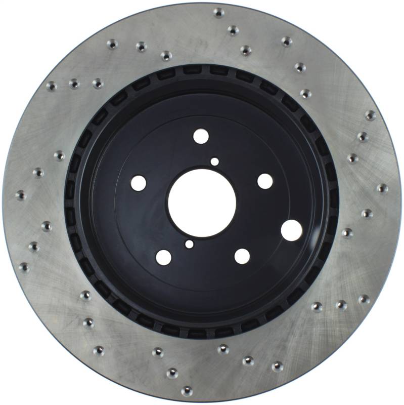 StopTech Drilled Sport Rotors are 1-piece direct replacement brake discs for factory brake systems and stock calipers that look great behind your wheels - and offer significantly improved braking performance. The unique cross-drilling aids with heat and brake dust dispersal; prevents glazing of the pads; adds bite and improves wet and dry braking performance. Built to last; the black e-coating provides protection from corrosion and the high carbon metallurgy (in most applications) offers quieter operation; better crack resistance and increased performance.