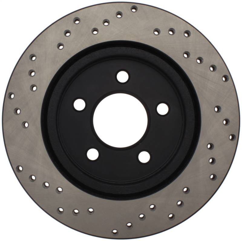 StopTech Drilled Sport Rotors are 1-piece direct replacement brake discs for factory brake systems and stock calipers that look great behind your wheels - and offer significantly improved braking performance. The unique cross-drilling aids with heat and brake dust dispersal; prevents glazing of the pads; adds bite and improves wet and dry braking performance. Built to last; the black e-coating provides protection from corrosion and the high carbon metallurgy (in most applications) offers quieter operation; better crack resistance and increased performance.