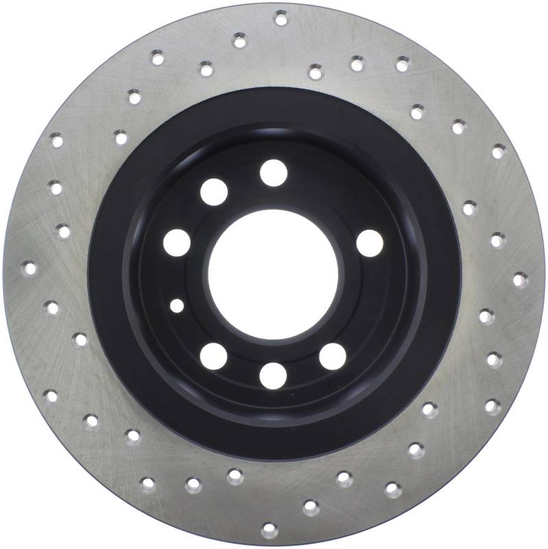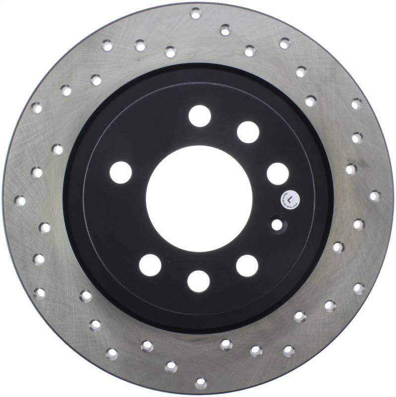 StopTech Drilled Sport Rotors are 1-piece direct replacement brake discs for factory brake systems and stock calipers that look great behind your wheels - and offer significantly improved braking performance. The unique cross-drilling aids with heat and brake dust dispersal; prevents glazing of the pads; adds bite and improves wet and dry braking performance. Built to last; the black e-coating provides protection from corrosion and the high carbon metallurgy (in most applications) offers quieter operation; better crack resistance and increased performance.