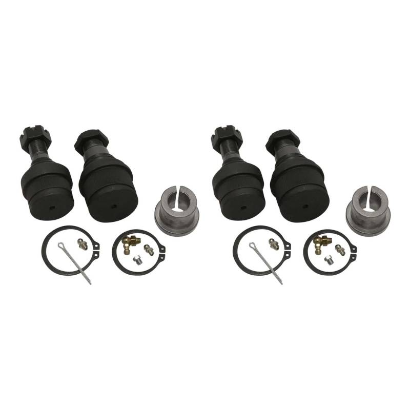 Replace and upgrade your failing OE ball joints with Yukon’s precision-built units constructed from strong high-tech materials. This kit replaces the upper and lower front ball joints on both sides and includes all the required small parts.\nSuperior materials lead to superior performance. When you replace and upgrade your failing OE ball joints with a heavy-duty Yukon unit you get a ball joint built to the highest standards of quality and durability. Its housing is CNC-machined from forged SAE 1045 carbon alloy steel and the ball stud is made from induction heat-treated, hot-forged 4140 chromoly. These ball joints use military-grade acetal bearings because of their advanced anti-friction properties and dimensional stability. Ball joints are only as durable as the protection provided by their rubber boots. Yukon ball joints feature a two-staged approach with a synthetic Neoprene/CR outer boot and an inner seal/pancake boot that safeguard the spherical joint and bucket against gritty road grime, oil, gas, and engine fluids, and extreme temperatures. This kit replaces the upper and lower front ball joints on both sides and includes Grade 8 hardware, castle nuts, c-clips, cotter pins, and zerk fittings.