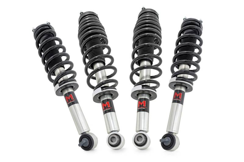 - Effortless Installation: Simple bolt-on design requires no cutting or drilling, making setup quick and straightforward.\ Smooth Factory Ride: Engineered to preserve the comfort and handling of your factory suspension.\ Boosted Ground Clearance: Gain extra height for improved off-road capability and a more commanding stance.\ Eliminates Factory Nose-Down Rake: Provides a level stance front to rear for a more aggressive, trail-ready look.\ Clears 35" Tires with No Modifications: Gain room for larger tires without the need for trimming or cutting.\ Premium Strut Options: Choose from Rough Country's N3 Loaded Struts, M1 Monotube Struts, or M1R Monotube Reservoir Struts to match your performance needs and driving style.\ Three-Year Manufacturer's Warranty: Protects against defects in materials and workmanship for long-term confidence..