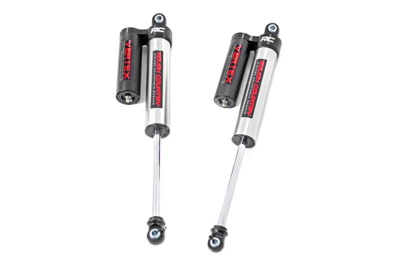 Unrivaled Ride Quality and Precision Tuning: Experience the pinnacle of off-road performance and on-road comfort with Rough Country's 2.5 Vertex Reservoir Shocks. Engineered for enthusiasts who demand elite performance without breaking the bank, these premium shocks deliver smooth handling and rugged durability across any terrain.Built to Dominate, Designed to Impress: Each shock features a massive 2.5-inch piston and high-flow 18mm chrome-hardened piston rod, offering unmatched shock control and fade resistance. The monotube design with external remote reservoir ensures superior heat dissipation and consistent performance, while Nitrogen-charged internals boost response and minimize shock fade in aggressive conditions.Durability That Goes the Distance: A 3-stage fortified seal system keeps out contaminants, extending the life of the shock even in the harshest environments. The honed steel body, paired with heat-treated alloy bearings, provides lasting strength, while a zinc-plated finish with double clear coat and over 400-hour salt spray rating ensures unbeatable corrosion resistance.Premium Styling with Rugged Substance: More than just performance, Vertex shocks stand out with CNC-machined billet aluminum accents, a laser-etched RC logo, and matching "Vertex" decals. Steel-braided reservoir lines and laser-cut brackets on the rear shocks elevate both form and function.Confidence Backed by Coverage: Rough Country backs the Vertex Shocks with an industry-leading 3-year manufacturer's warranty, so you can hit the trail or street knowing your suspension is ready for anything.